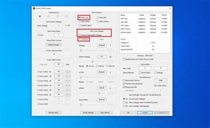 Start by ticking some necessary boxes. Make sure CPU Core is selected, and also Adaptive a little under that. The next step will be to start undervolting.